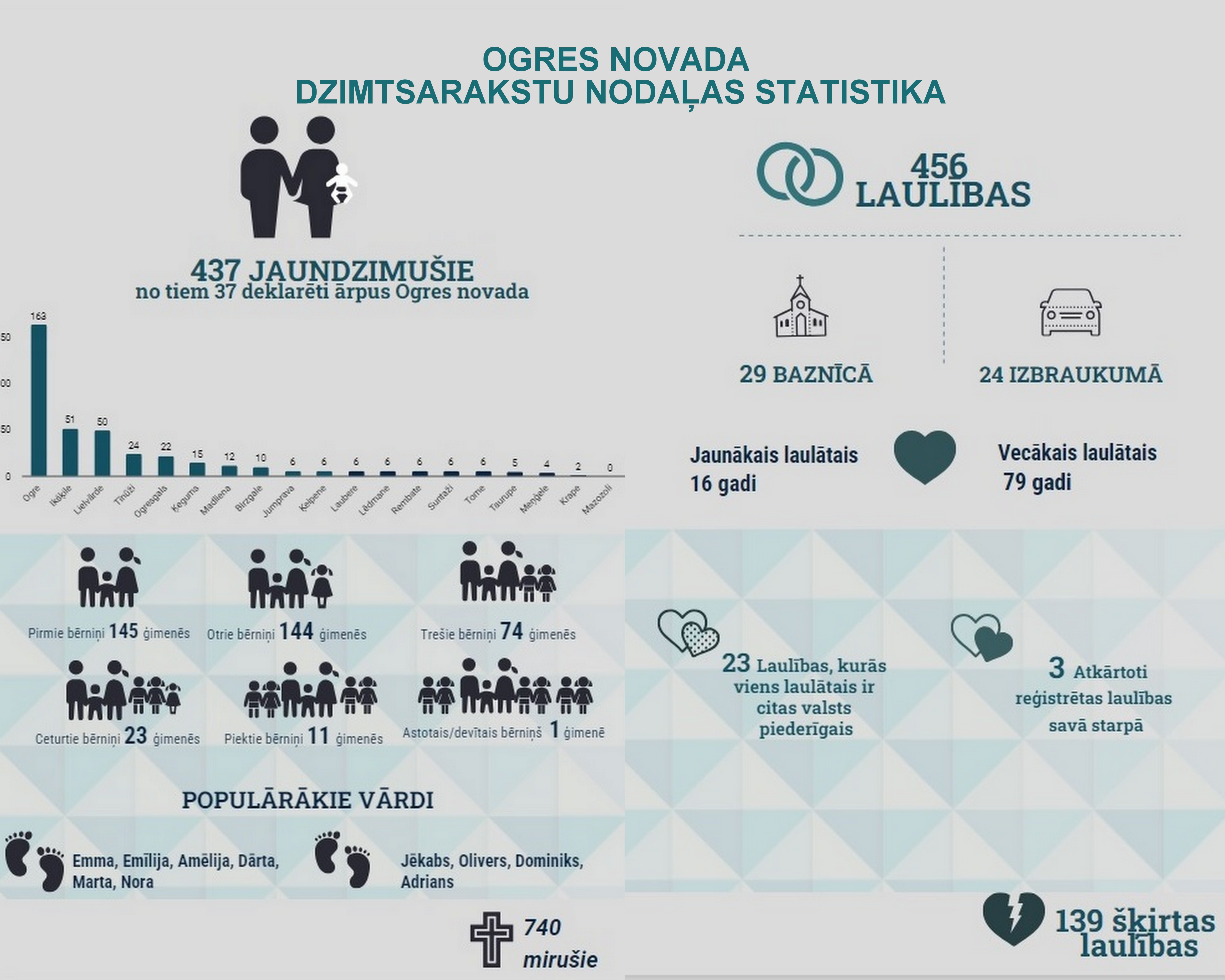Pērn reģistrēto jaundzimušo sadalījums pa novada pilsētām un pagastiem ir šāds: Ogrē 163, Ikšķilē 51, Tīnūžu pagastā 24, Lielvārdē un Lielvārdes pagastā 50, Ķegumā 15, Ogresgala pagastā 22, Madlienas pagastā 12, Birzgales pagastā 10, Jumpravas, Ķeipenes, Lauberes, Lēdmanes, Rembates, Suntažu un Tomes pagastā – katrā 6, Taurupes pagastā 5, Meņģeles pagastā 4, Krapes pagastā 2, neviens jaundzimušais nav reģistrēts Mazozolu pagastā.